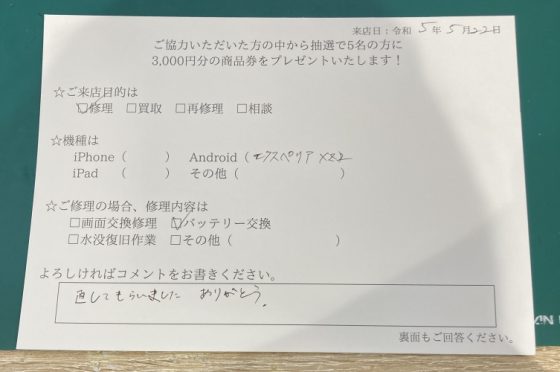 XZ2バッテリー交換 お客さまよりコメントを頂きました