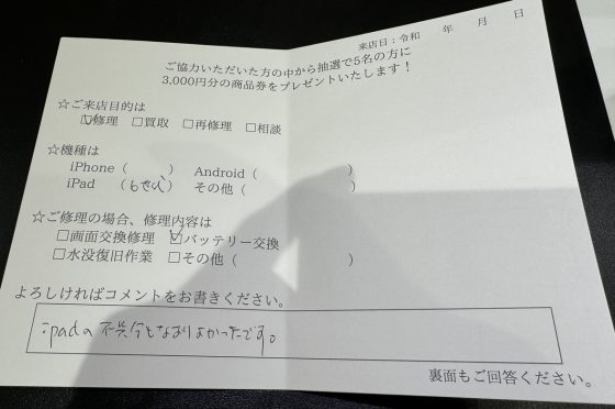 iPad (第6世代)バッテリー交換のお客様よりコメントを頂きました