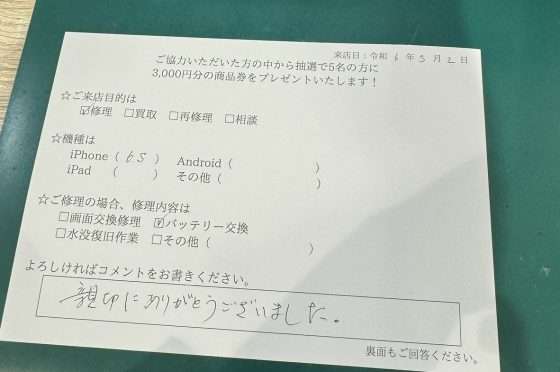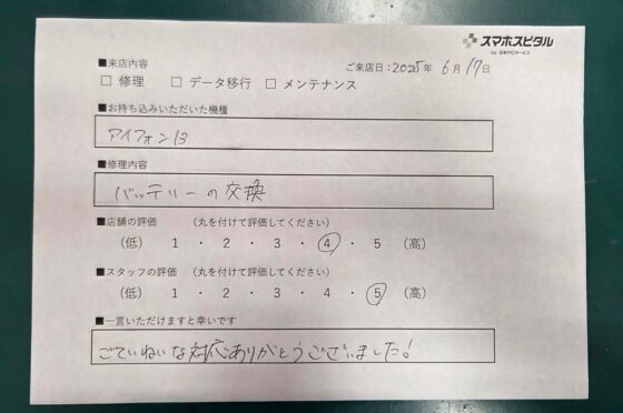 iPhone6sバッテリー交換のお客様よりコメントを頂きました。