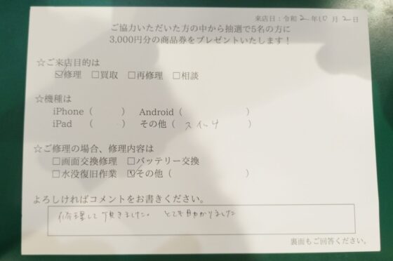 Nintendo switchのSDカードスロット交換修理をご依頼頂いたお客様よりコメントを頂きました!