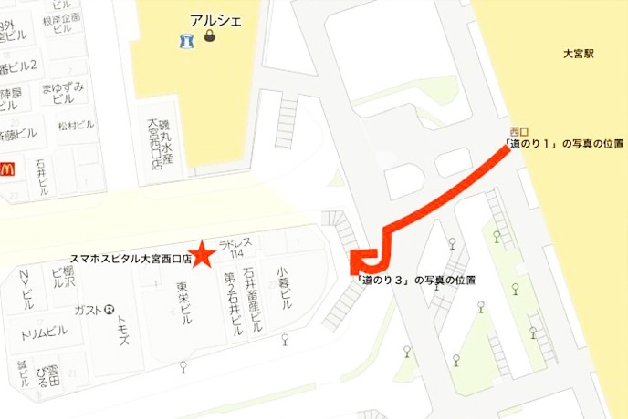 スマホスピタル 埼玉大宮店は大宮駅西口より徒歩1分の駅近です。ペデストリアンデッキを降りていただき、Wendy'sの通りを直進いただくと、すぐに1階にSha Maison、2階に煮干丸が入ってる山中ビルがありますのでそのビルの4Fが当店で御座います。近場にはアルシェや丸井等が御座いますので修理の間、お買い物や食事等でお時間を有効活用いただけます。スマホスピタル 埼玉大宮店ではiPhoneだけではなく、ipadやAndroid、人気ゲーム機のSwitch、3DS等の古いゲーム機の破損・不具合の即日修理も承っております。修理でお悩みの方はお気軽にご連絡下さいませ。
