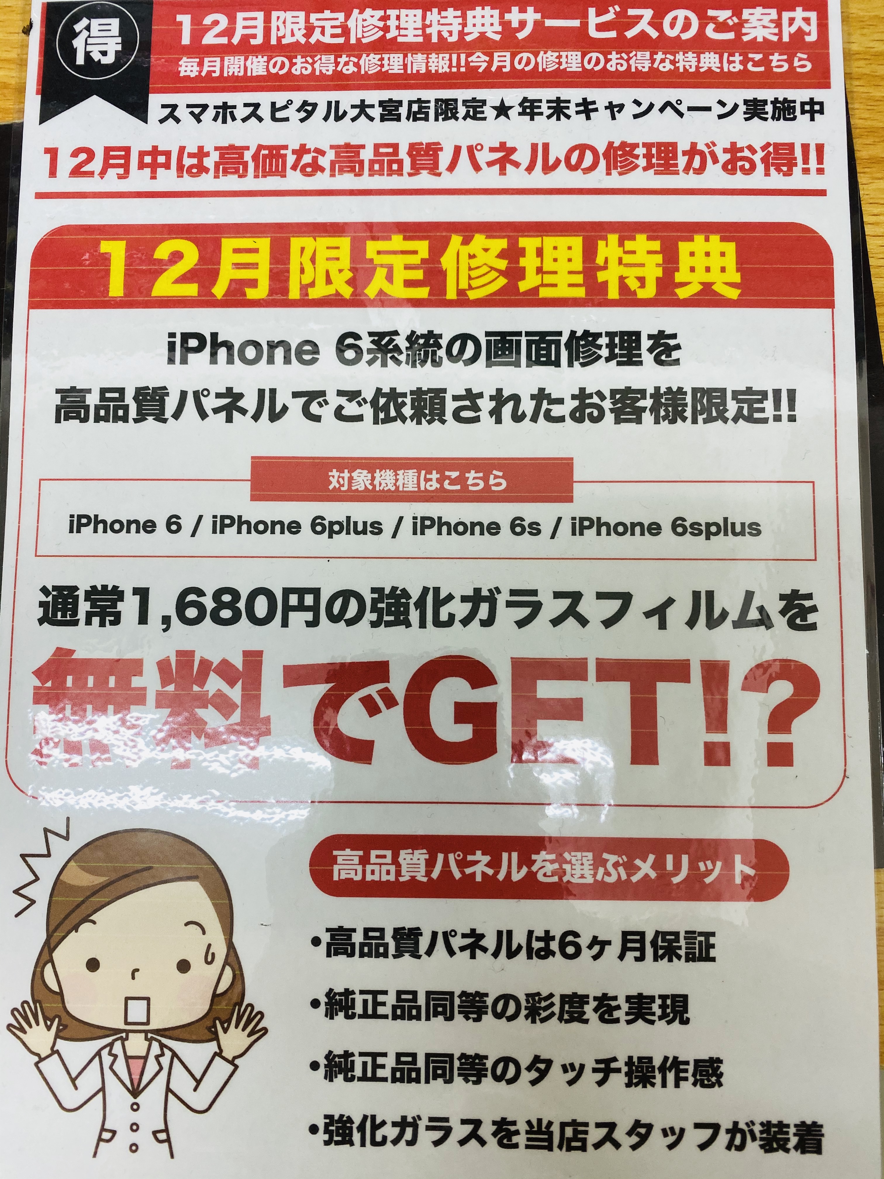 12月よりiphone6,6 Plus,iphone6s,6s Plusを対象に高品質液晶パネルで画面修理をご依頼されたお客様限定で!!
