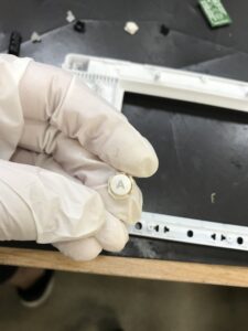 基板を取り外しました。写真左上のあたり、ヒンジ部分が根元から折れているのがよくわかります。
