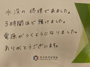 水没の修理で来ました。 3時間ほど預けました。 電源がつくようになりました。 ありがとうございます。