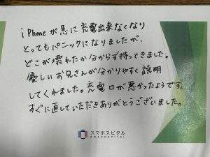 iPhoneが急に充電出来なくなりとてもパニックになりましたが、どこが壊れたか分からず持ってきました。優しいお兄さんが分かりやすく説明してくれました。充電口が悪かったようです。すぐに直していただきありがとうございます。