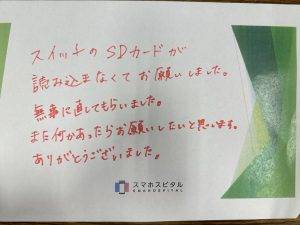 switchのSDカードが読み込まなくてお願いしました。 無事に直してもらいました。またなにかあったらお願いしたいと思います。 ありがとうございました。