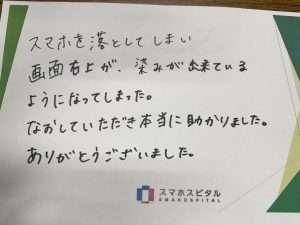 スマホを落としてしまい画面右上が、 シミが出来ているようになってしまった。 治していただき本当に助かりました。 ありがとうございました。