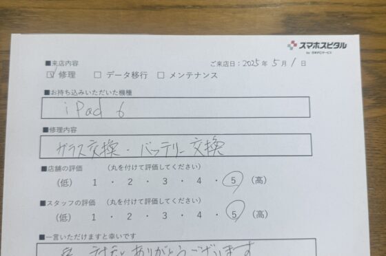 【お客様の声】iPad6のガラスとバッテリー交換!!