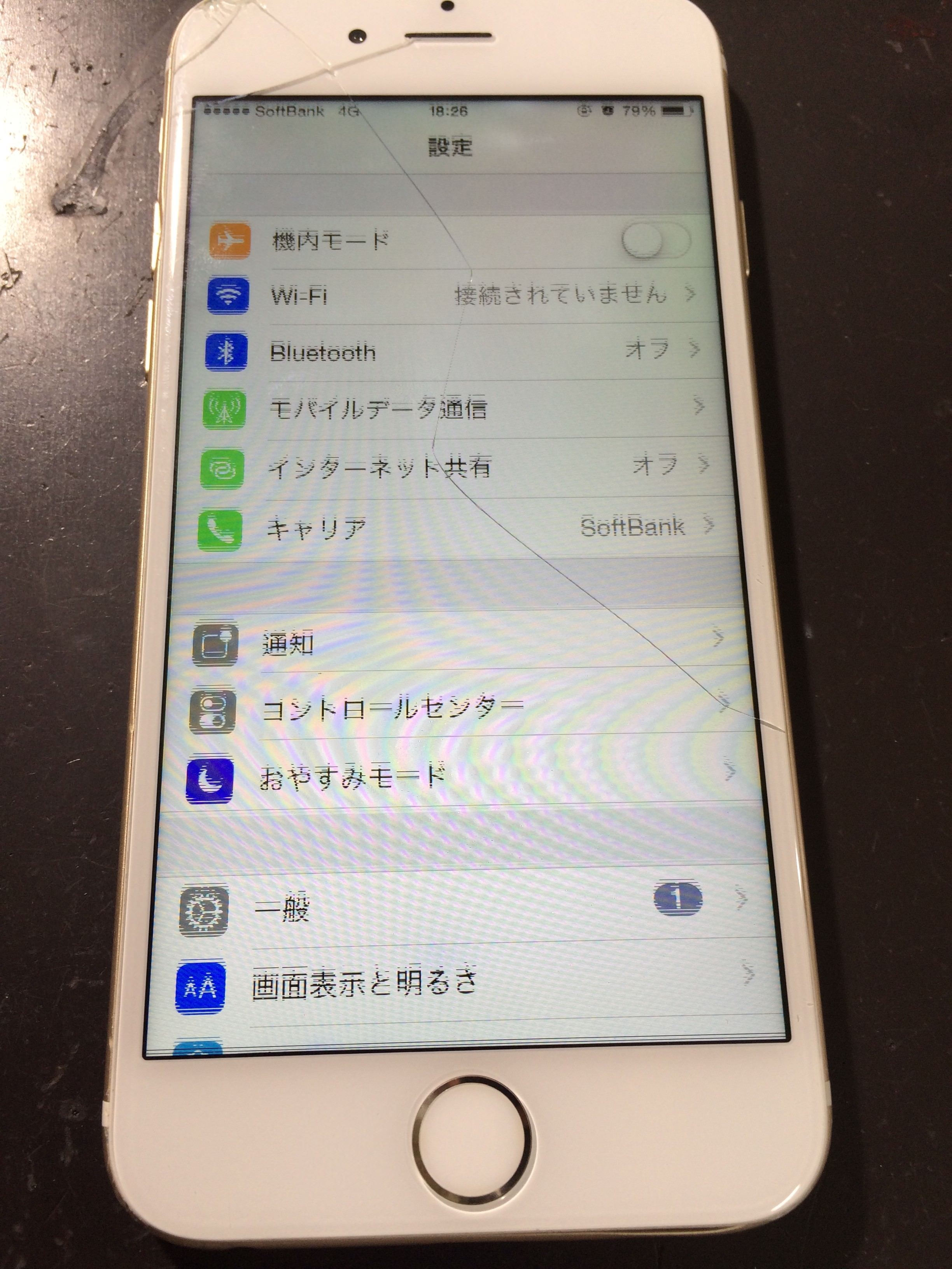 こちらのiPhoneは落としてしまったようで画面にヒビがが入ってしまっているのと、液晶がぶれてしまっています。