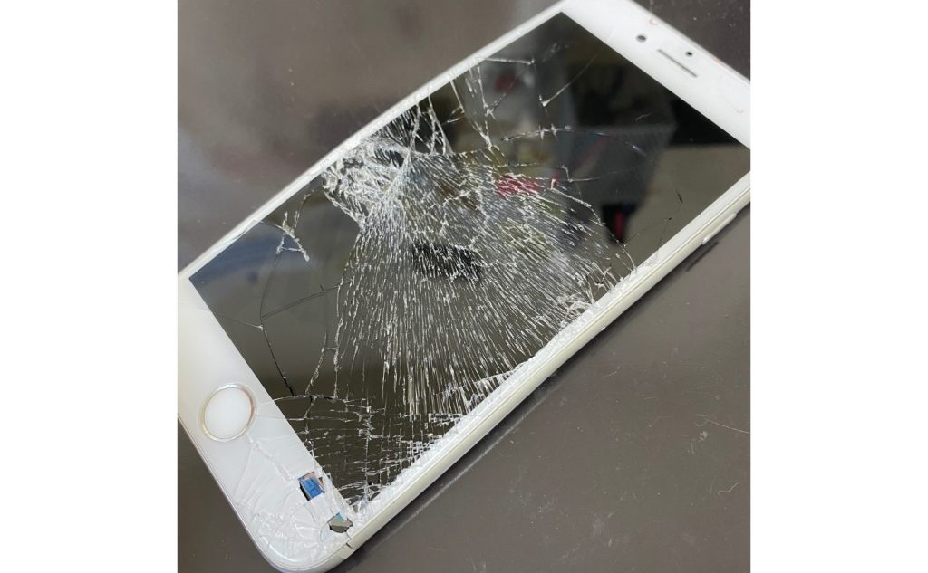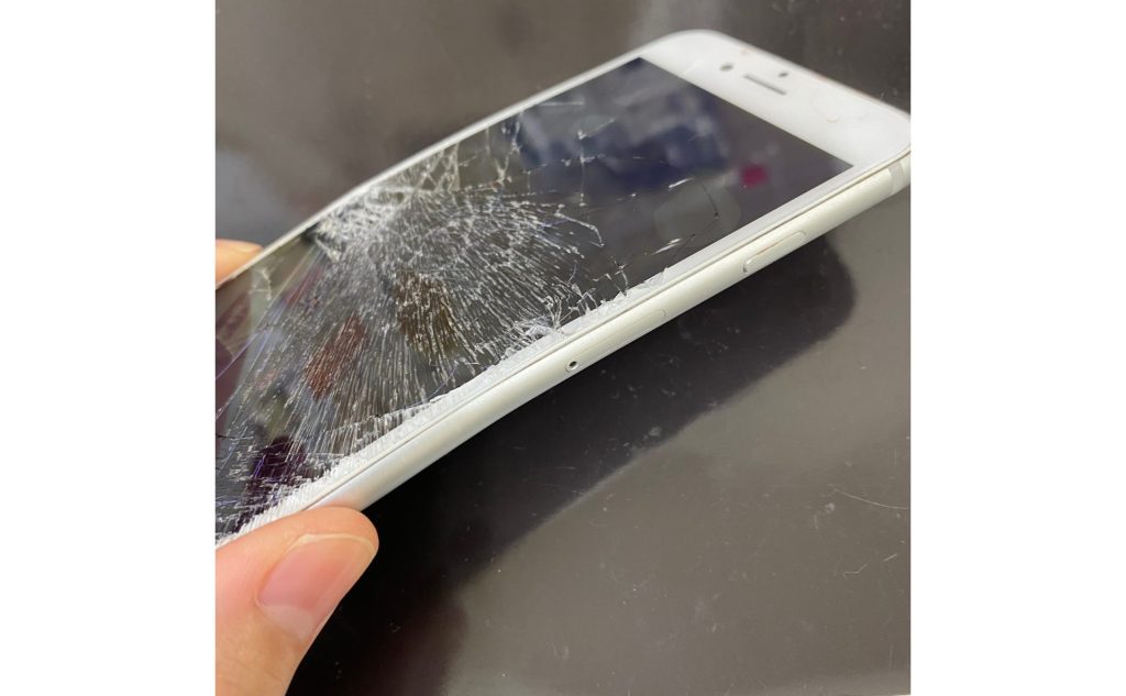 車に引かれたとの事で、本体がくの字に変形してしまっている状態のiPhone8・・・。