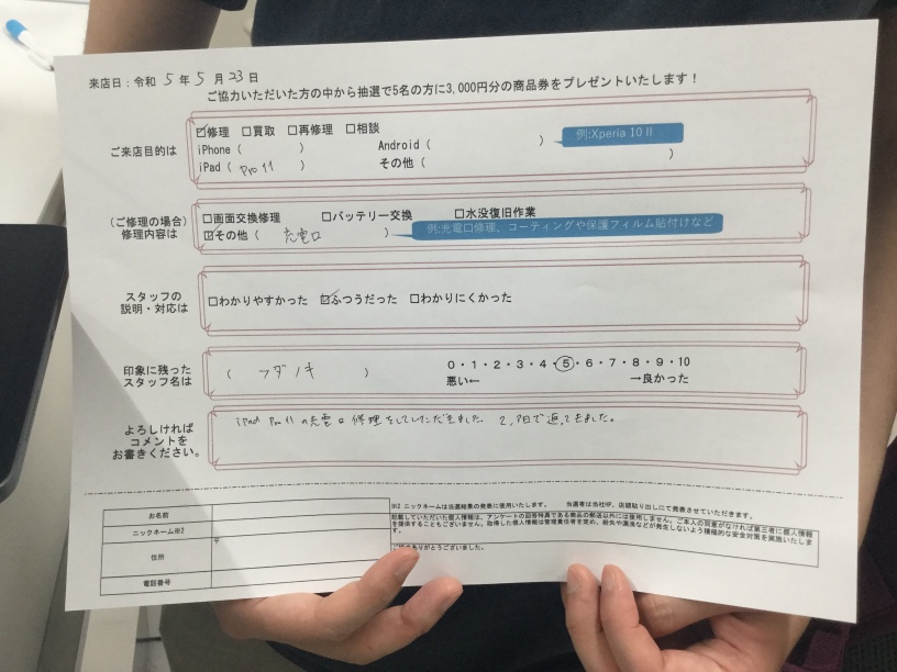 【お客様の声】iPadPro11インチの充電口交換していただきました