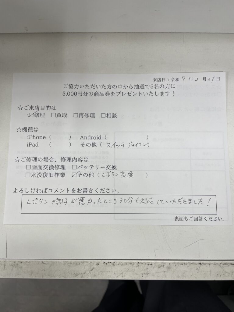 スマホスピタル三軒茶屋 【お客様の声】SwitchのJoy-ConLボタン交換をさせて頂きました!!