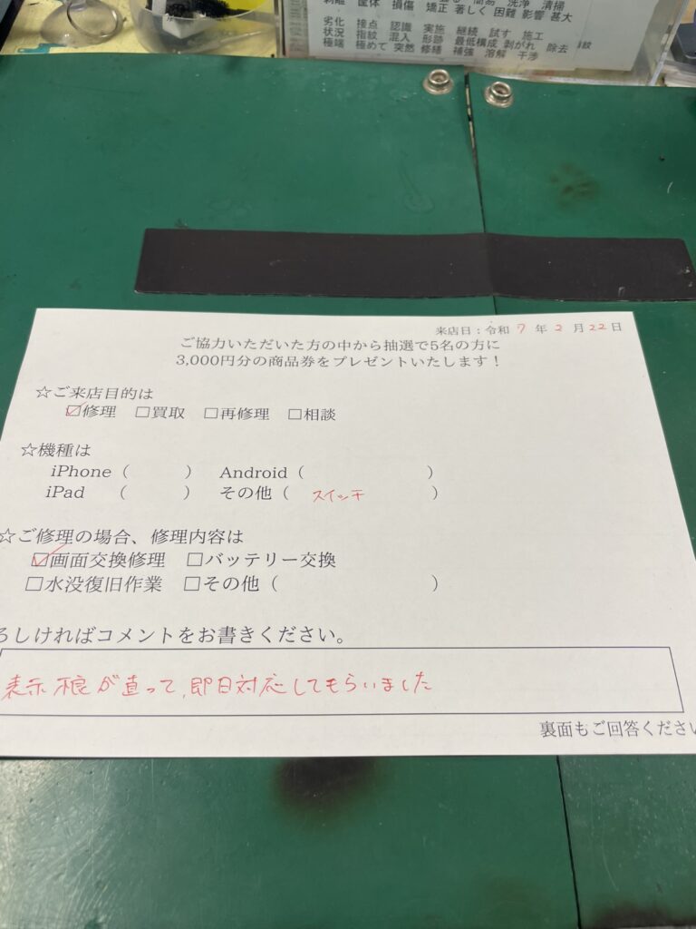 スマホスピタル三軒茶屋 【お客様の声】Nintendo Switch の液晶交換をさせて頂きました。