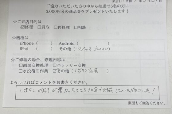 【お客様の声】SwitchのJoy-ConLボタン交換をさせて頂きました!!