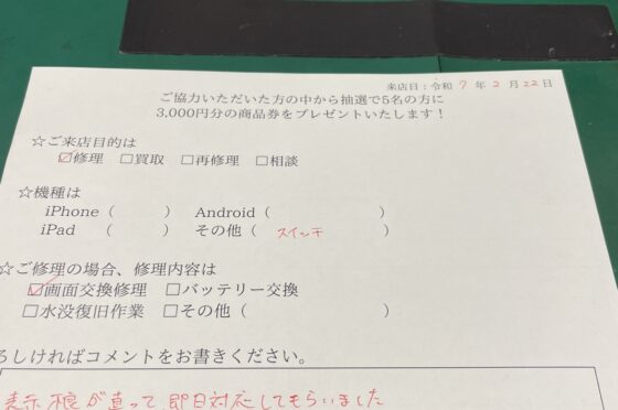 【お客様の声】Nintendo Switch の液晶交換をさせて頂きました。