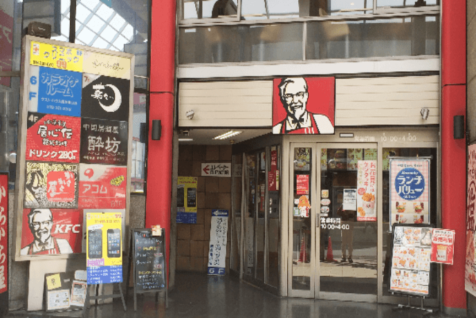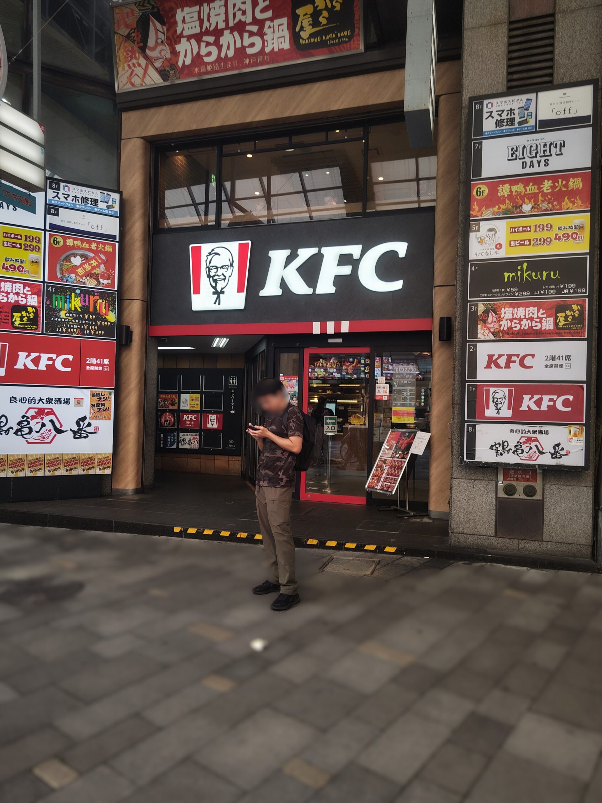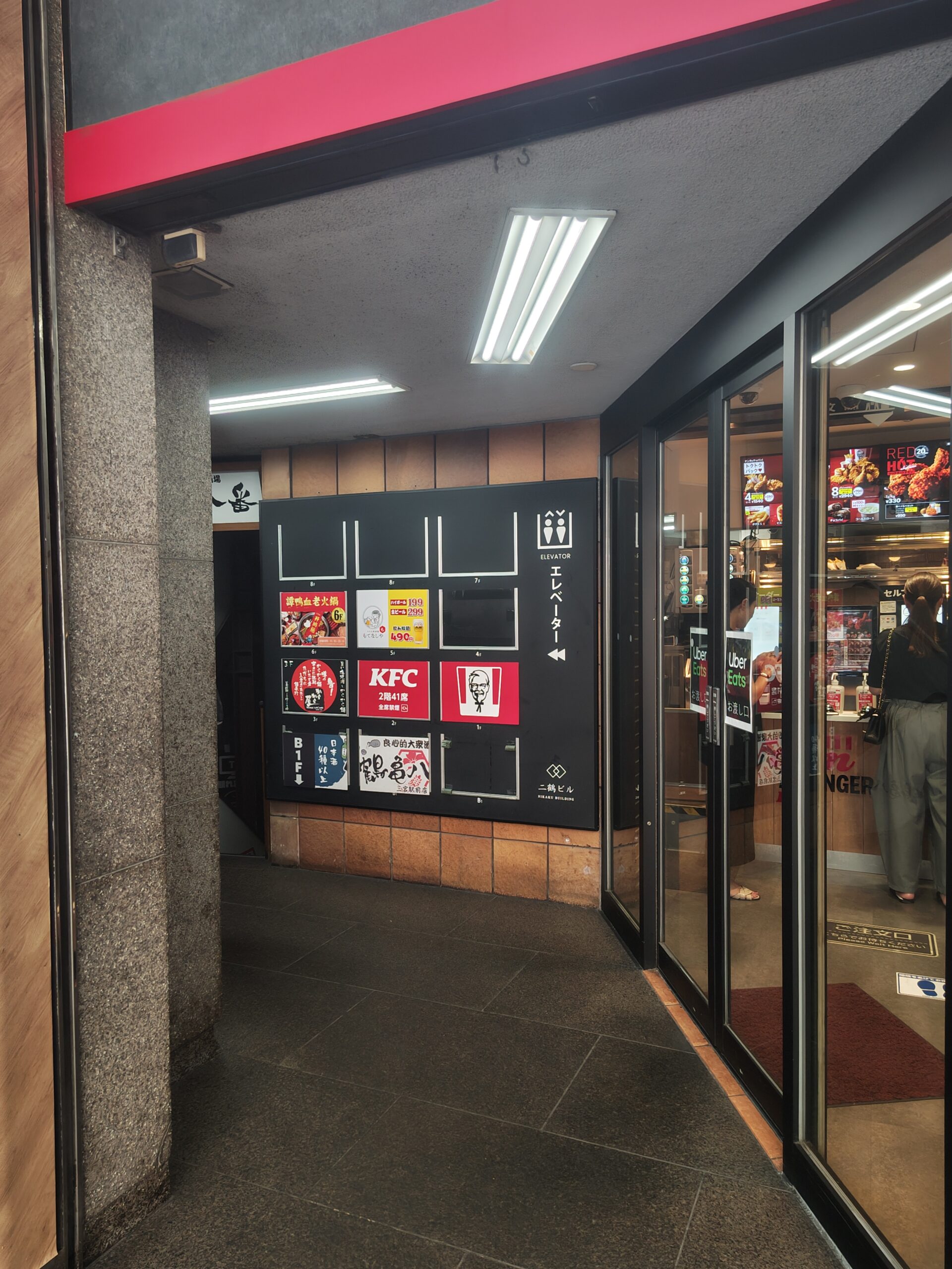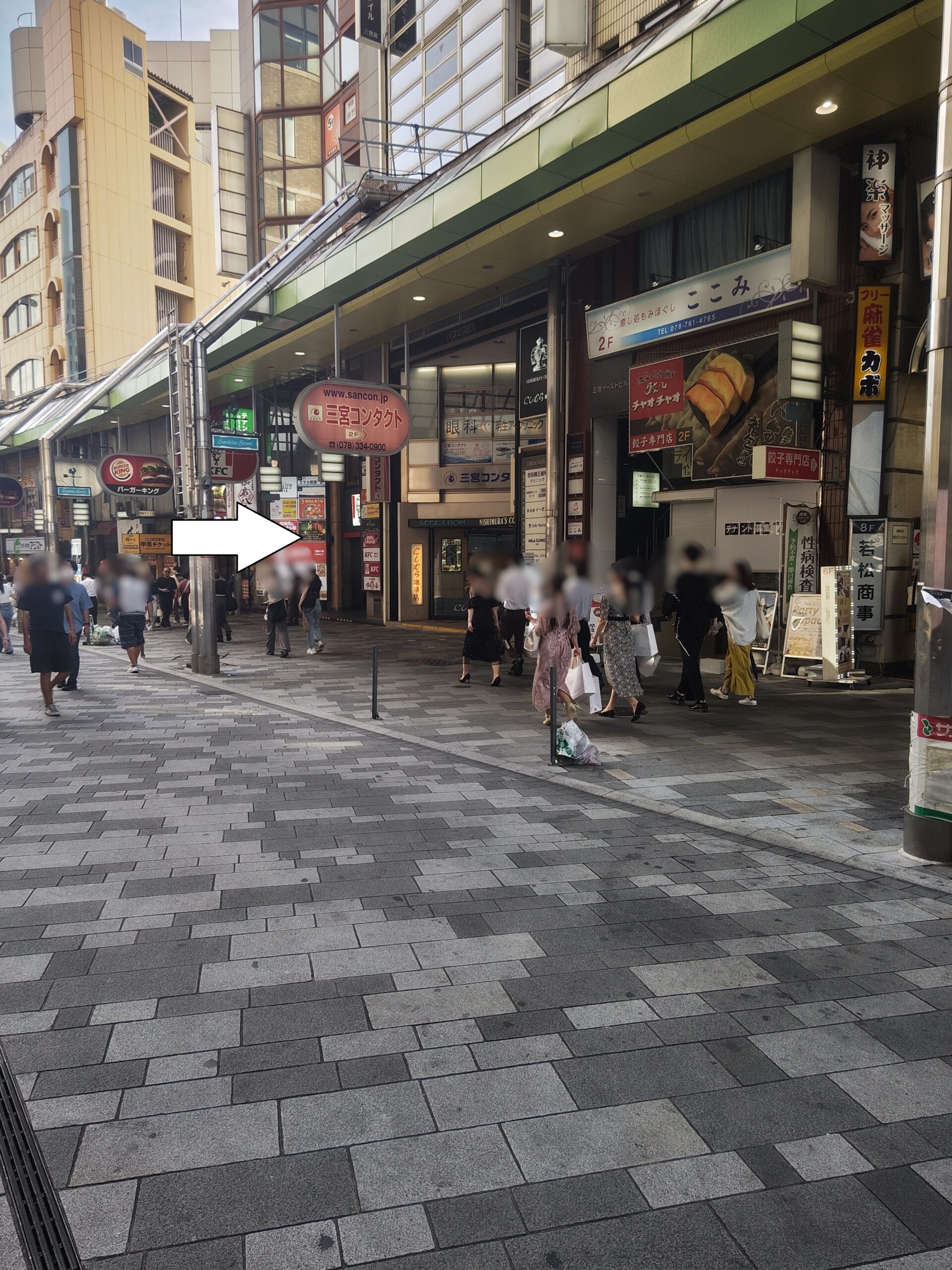 JR三ノ宮駅西口を右に曲がり真っ直ぐ進むと向かい側にケンタッキーがあります。横手の看板が並んでいるところに当店の看板があります。 看板の並んだ裏手側のエレベータで7階まで上がりそこから8階まで階段で上がると当店があります。