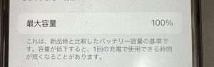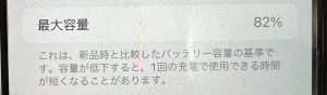この様に、バッテリーの最大容量が82%まで落ちてしまっています。iPhoneの場合だと、ここの数字が80%を下回ってしまうとバッテリーの劣化が進んでいるため交換時期という感じですね。その他にも、使用頻度によりますが大体二年程がバッテリーの寿命とも言われております。