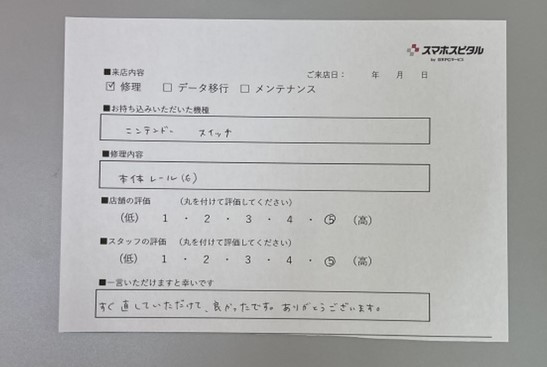 【お客様の声】Nintendo Switchの本体レール(右側)の交換をさせていただきました。