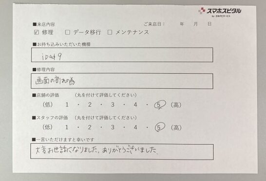 【お客様の声】iPad9のガラス交換をさせていただきました。