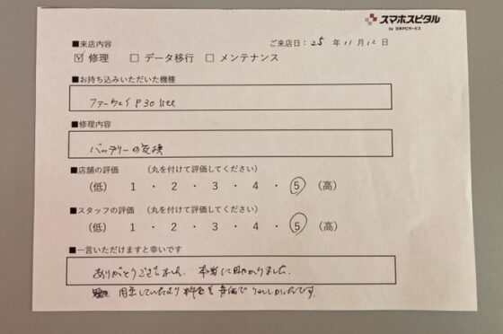 【お客様の声】HUAWEIP30liteのバッテリー交換をさせていただきました。