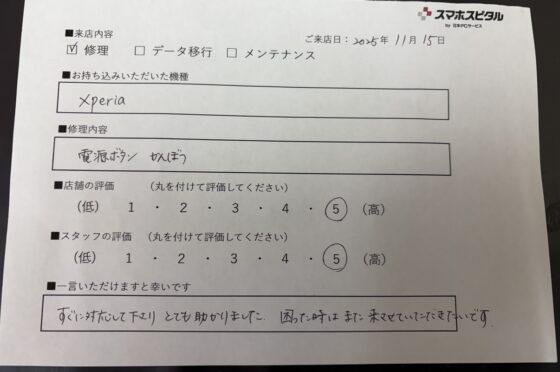 【お客様の声】Xperiaの電源ボタンのメンテナンスをさせていただきました。