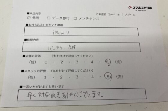 【お客様の声】iPhone13のバッテリーを交換修理させていただきました。