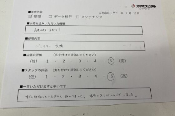 【お客様の声】AQUOS Zero6のバッテリーを交換修理させていただきました。