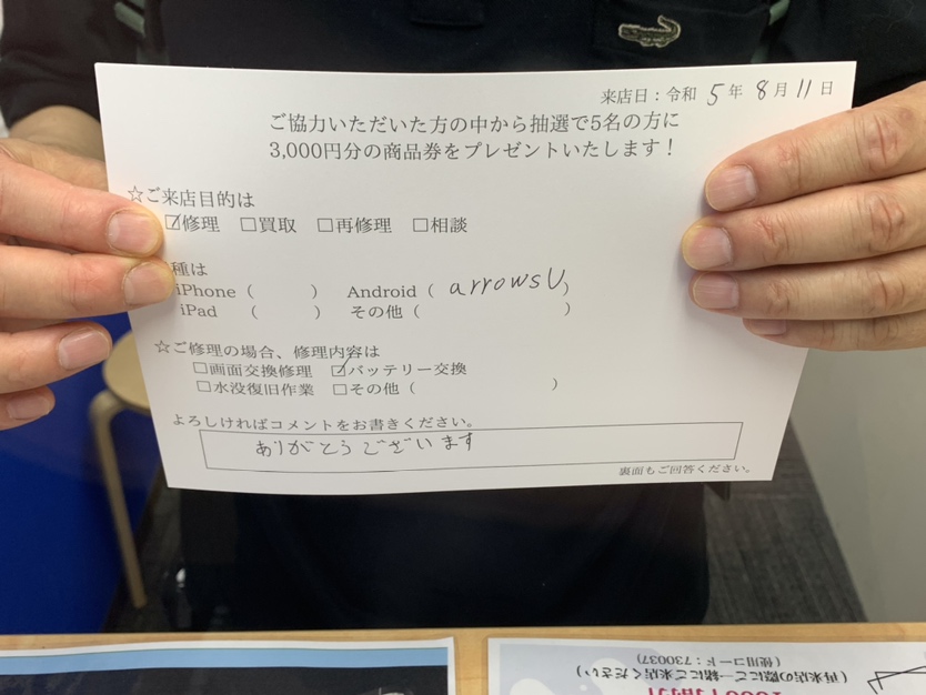 スマホスピタル神戸三宮 Arrows Uのバッテリー交換をしました!