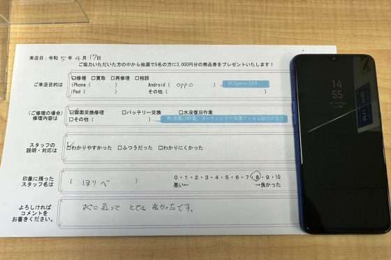 oppo reno Aの画面交換修理を行いました!