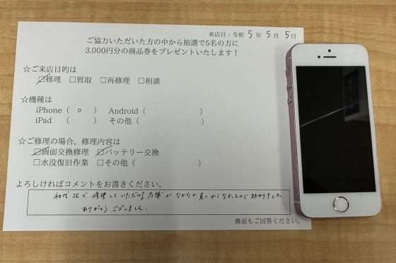 iPhoneSEの画面交換修理とバッテリー交換をおこないました!