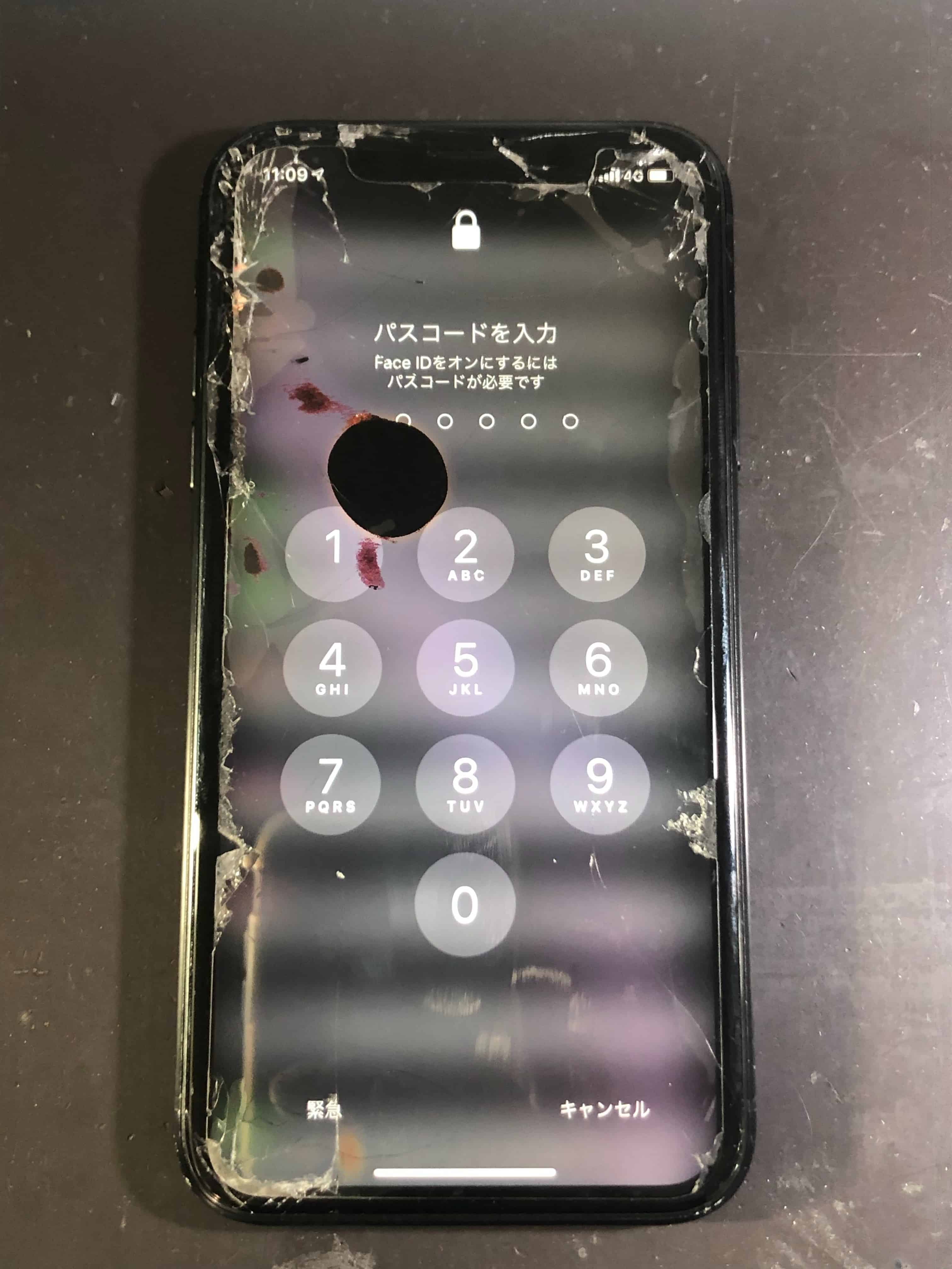 画面に貼られているガラスフィルムを貫通して画面が割れているので相当な衝撃だったのでしょう・・・