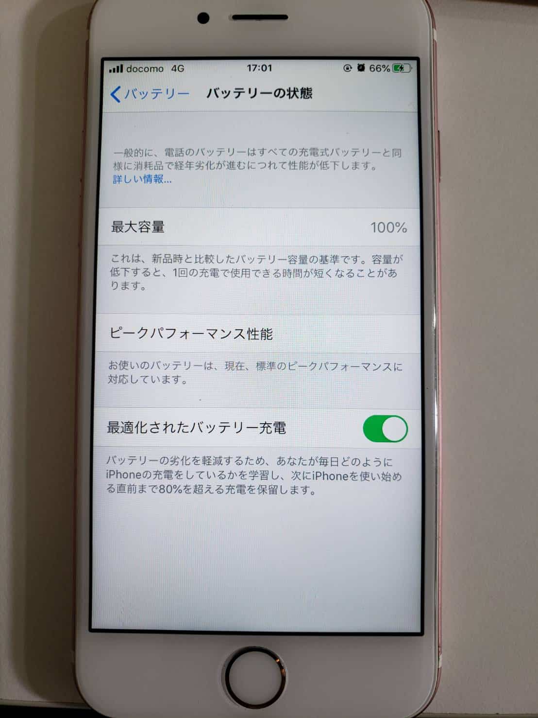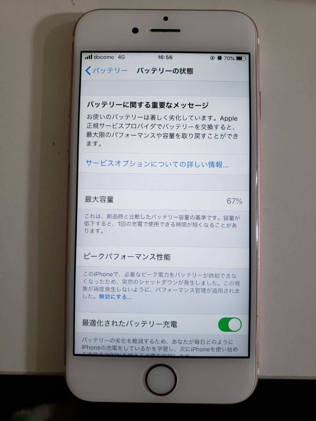 バッテリーの最大容量は、大体80%台になってくると、充電の減りが早くなってきます。