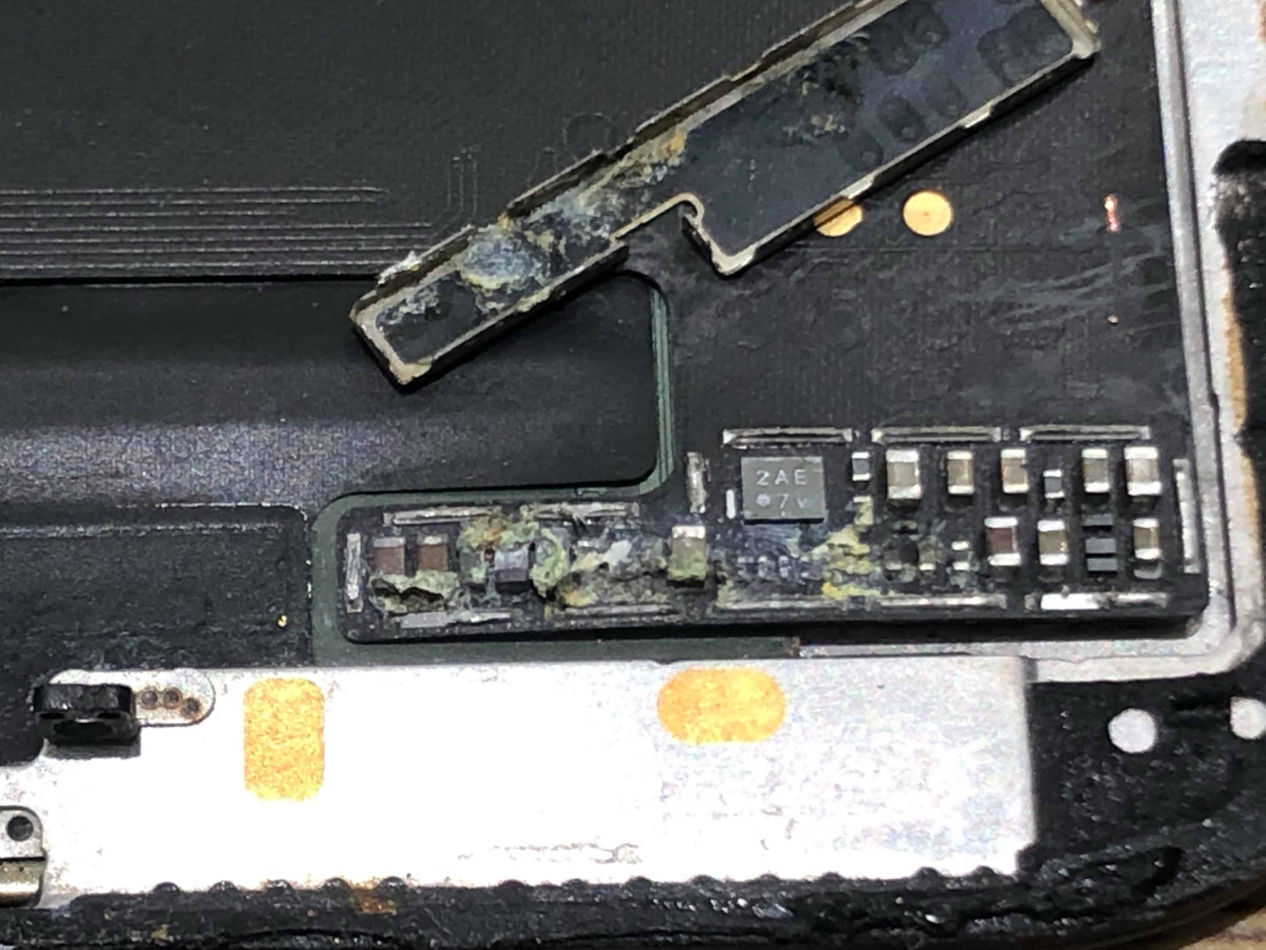 元々ついていたディスプレイパーツはよく観察していくと、搭載しているICチップの付近にショートした痕跡があったのでシールドを取り外して詳しく見ていくと激しい腐食箇所を確認できた。