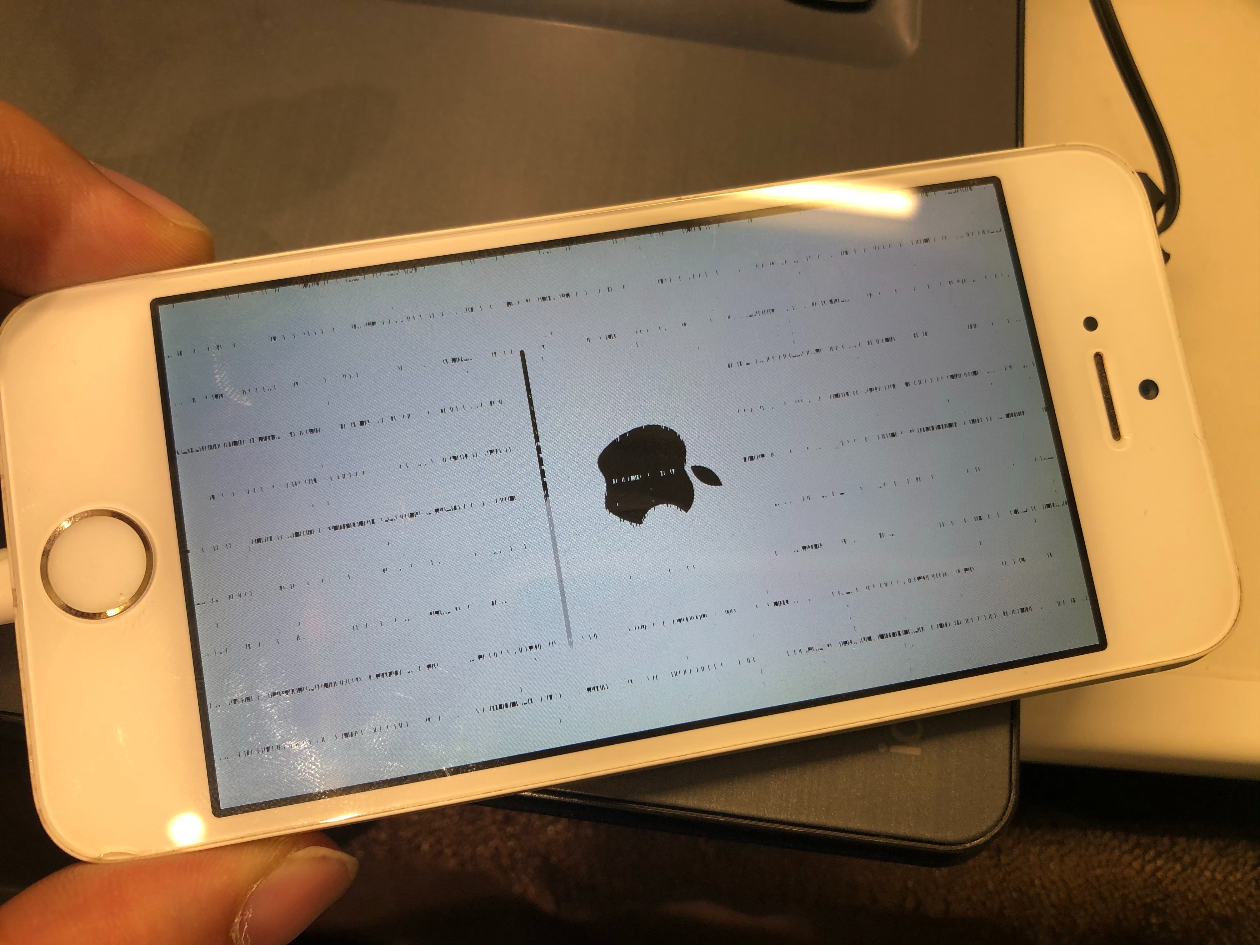 リンゴマークのまま固まって動かなくなってしまった状態のiPhone SE。