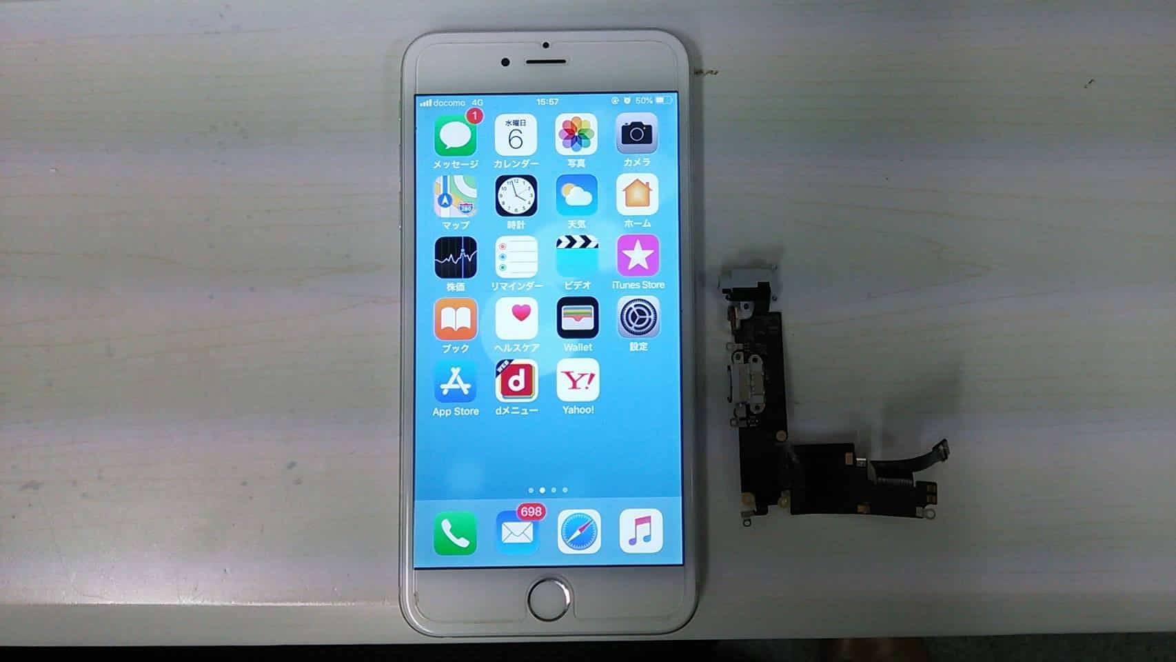 iPhone 6Plus以外の機種も殆ど同じような形状ですが、イヤフォンジャック部分はドックコネクターケーブルと同じところについている為、ドックコネクター交換をさせて頂いて改善できるかどうかといった修理となります。