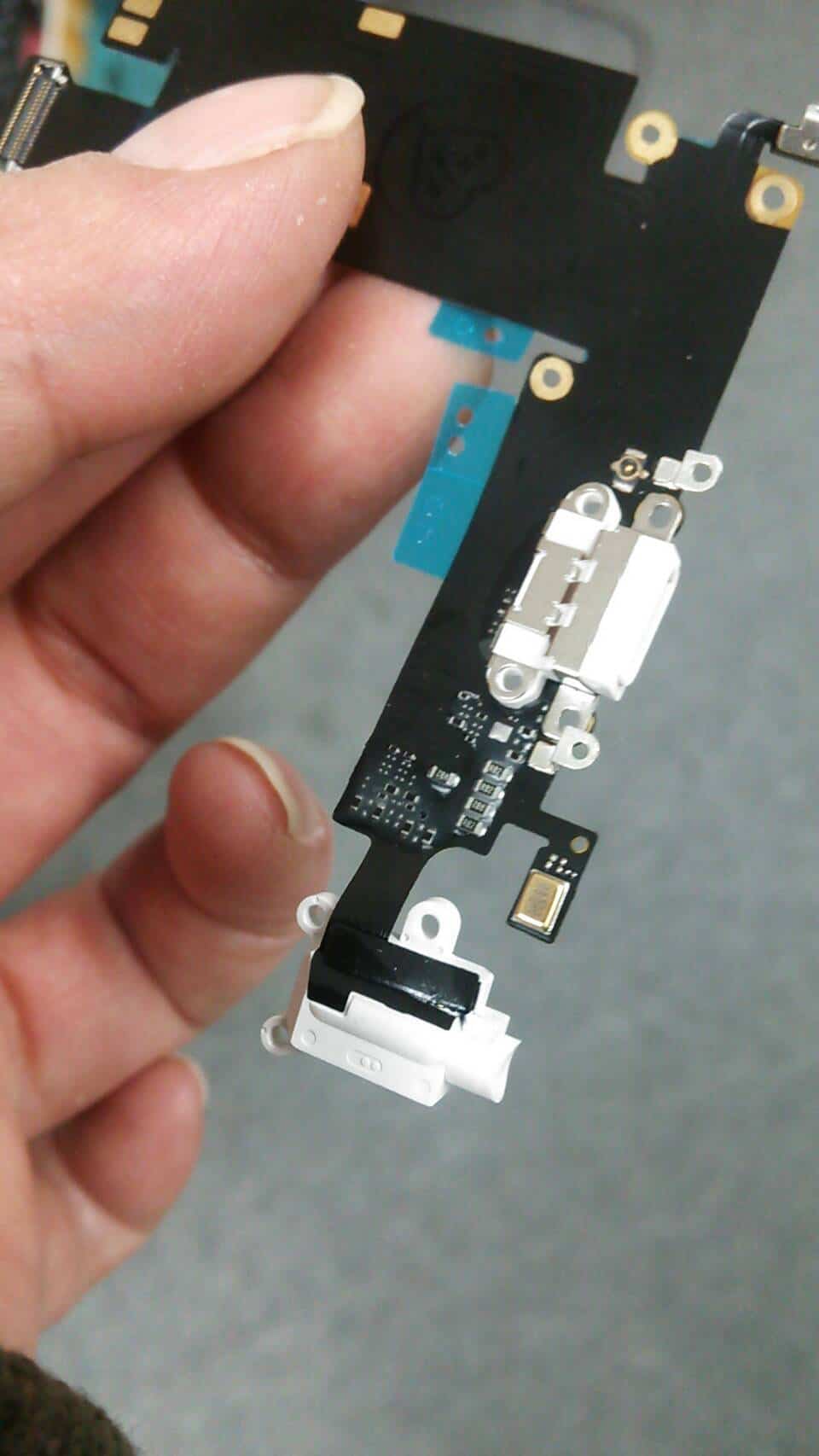 真ん中の白い部品部分がドックコネクター部分(充電口)になるのですが、もう一つの白い部分がイヤフォンジャック部分となります。ここだけが故障してしまったという事ですね。