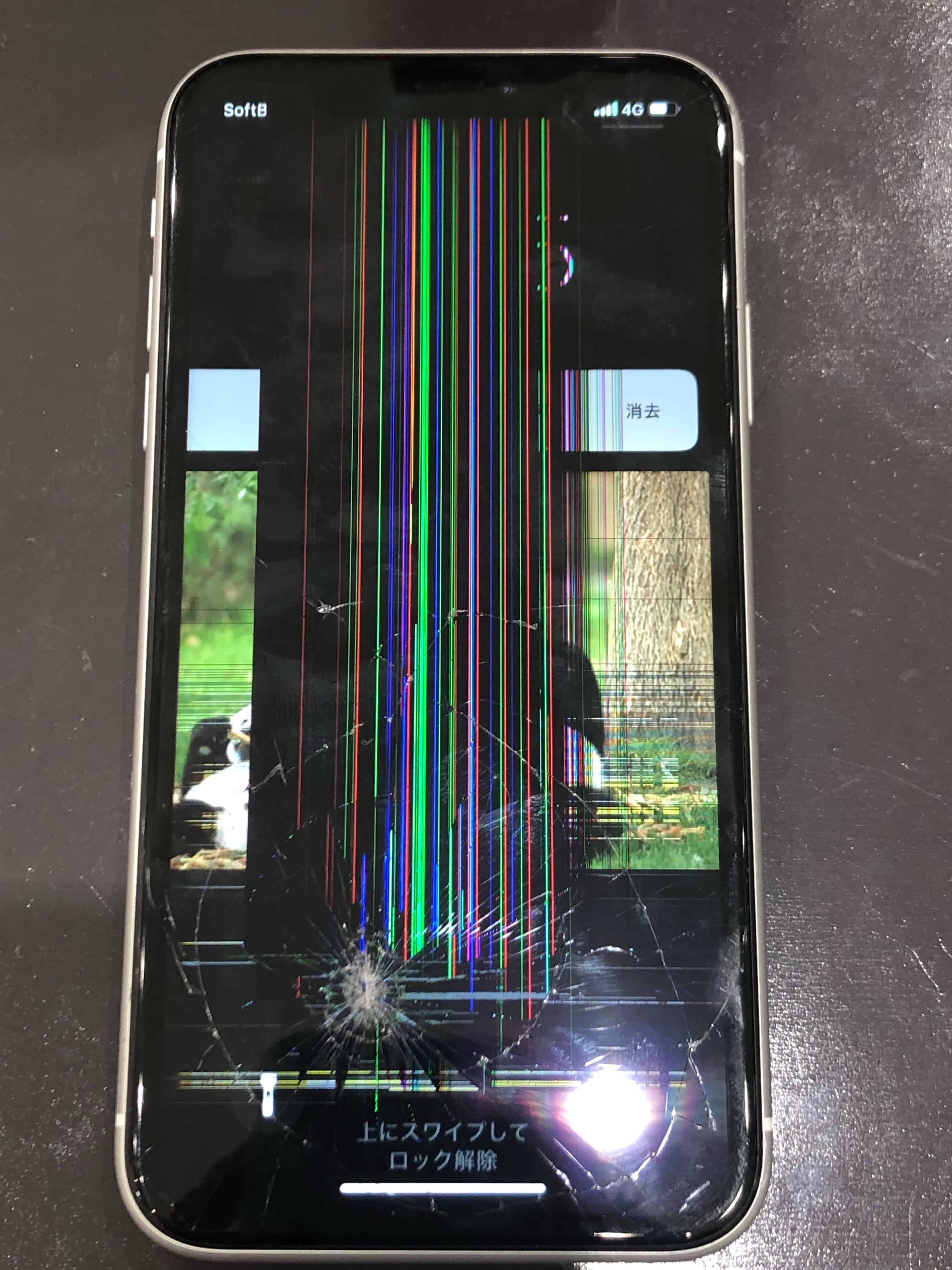 飛び込みの修理依頼を即日修理!iPhone XRが割れて液晶画面が壊れて正しく表示されない端末