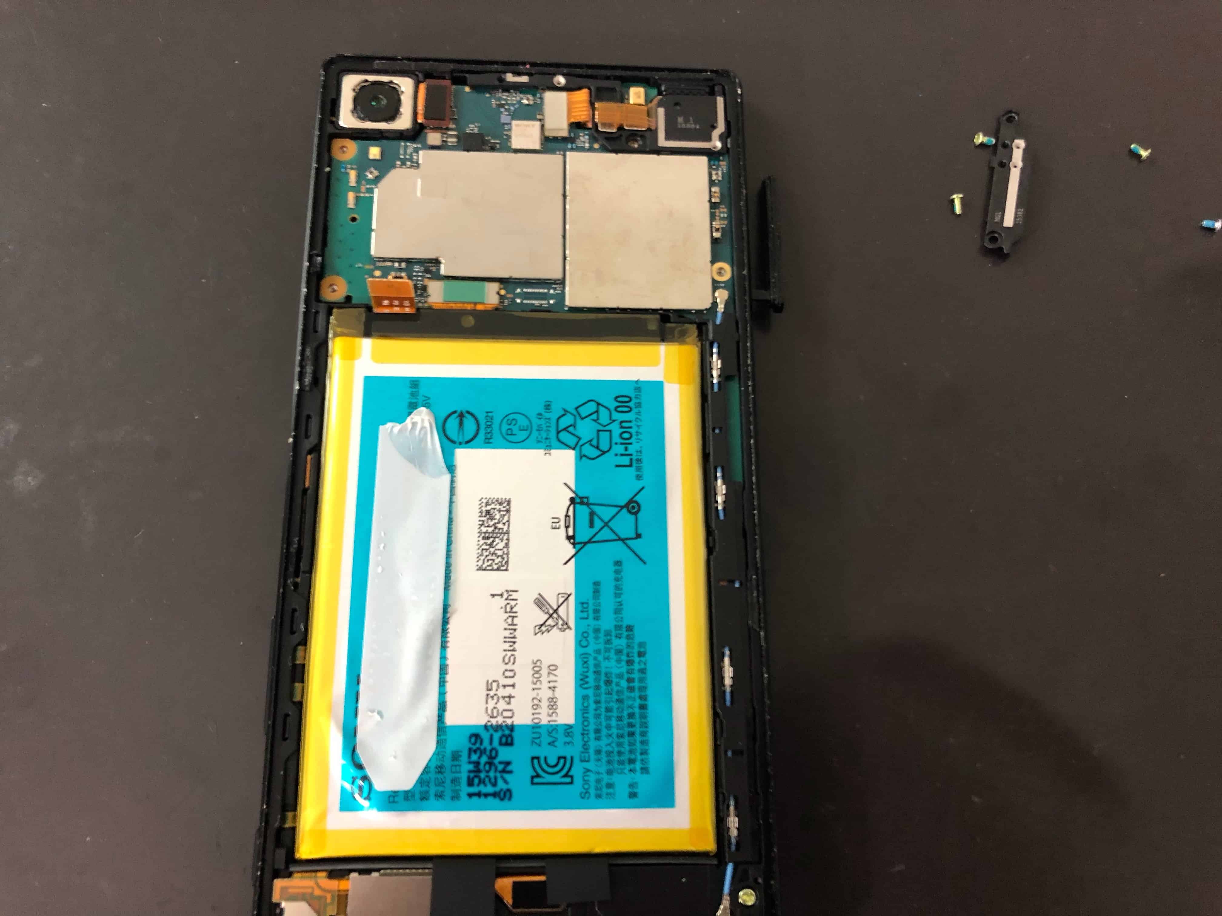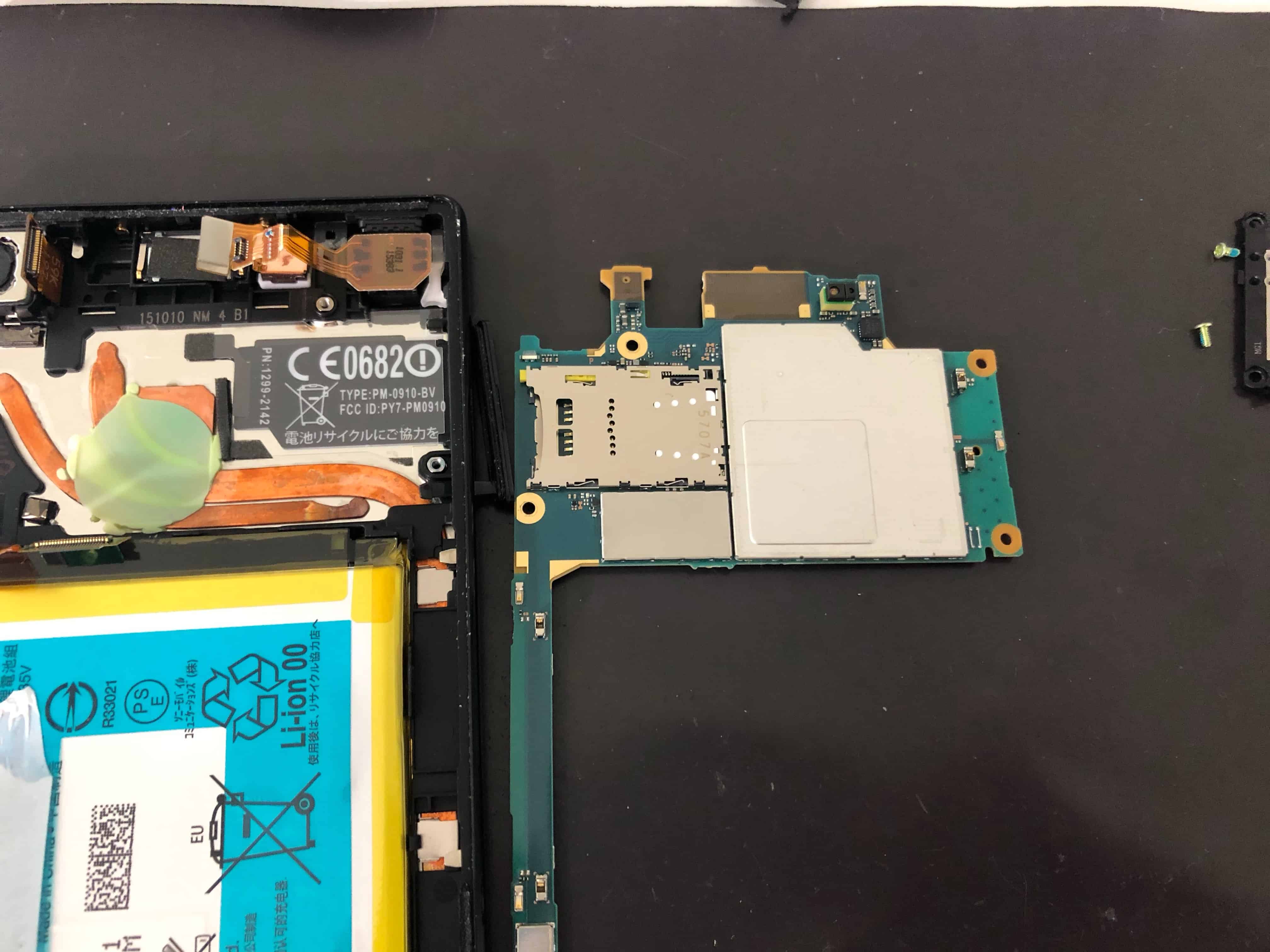 バックパネルを外すとこのようになっているのですが、SIMカードの読み取り部分は上部に見えているメイン基板の裏側に位置しているので、基板自体を取り外していきました。