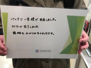 「バッテリー交換で来店しました。30分で完了しました。説明もわかりやすかったです。」