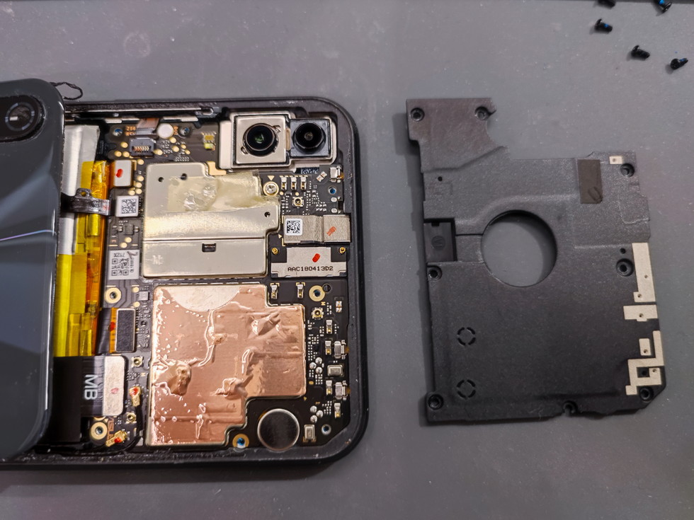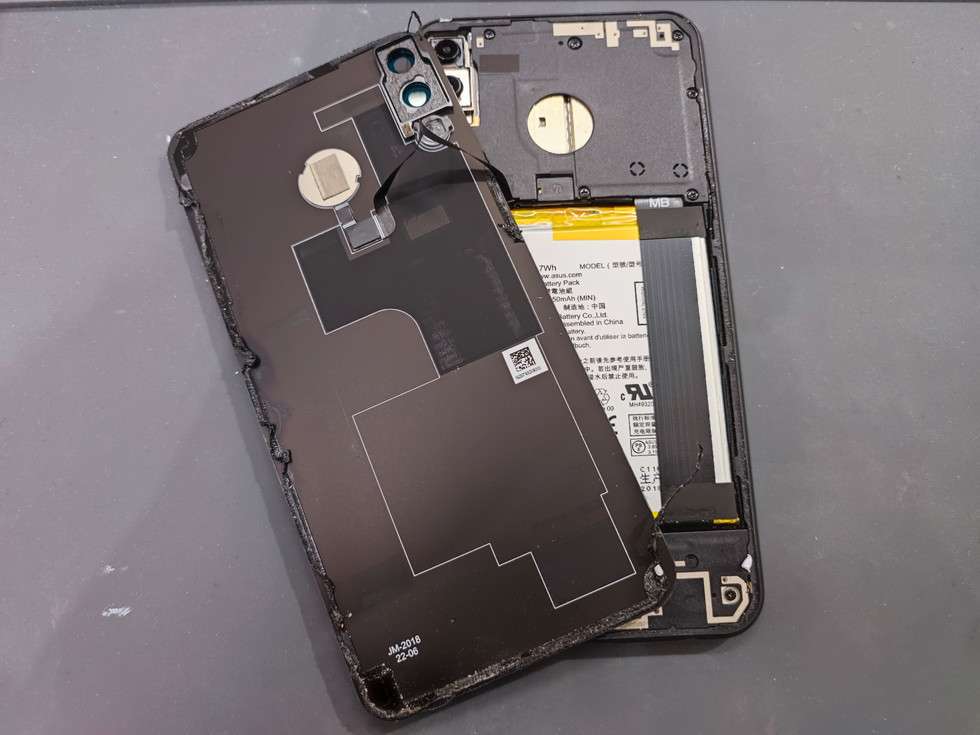 これでようやく指紋センサのケーブルが抜けるので、バックパネルも取り外せます。