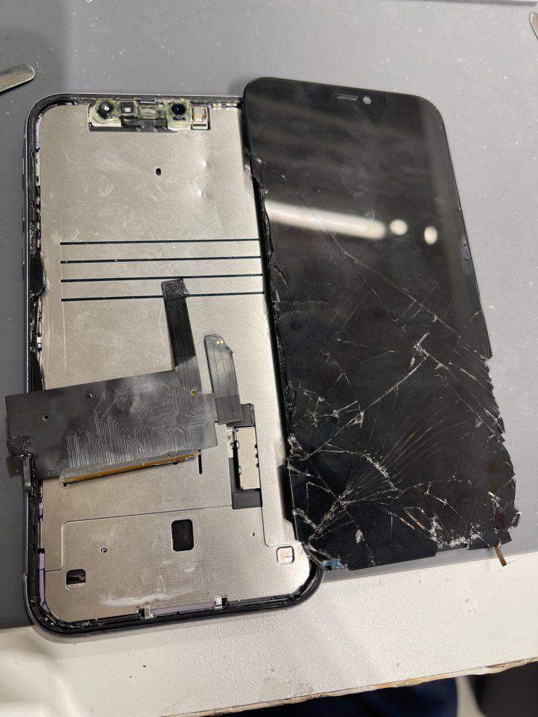 ガラスと淵の黒い部分が完全に剥離してしまい、更には画面と基板を繋ぐケーブルも切れていました。