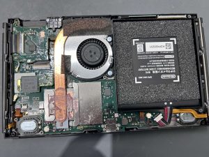 よくみる緑色の基板や、写真右側には大きなバッテリー、そして真ん中に見えるのが今回交換修理を行う冷却ファン部分です。