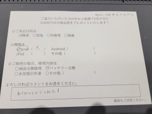 スマホスピタル 新宿 iPhone Xのバッテリー交換修理のお客様からコメントをいただきました!
