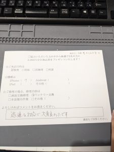 スマホスピタル 新宿 iPhone7のバッテリー交換修理のお客様よりコメントを頂きました。