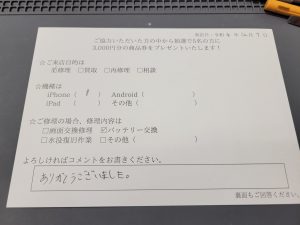 スマホスピタル 新宿 iPhone8 バッテリー交換のお客様よりコメントを頂きました。