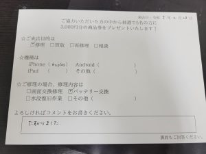 スマホスピタル 新宿 iPhone 6sPlusのバッテリー交換のお客様からコメントを頂きました