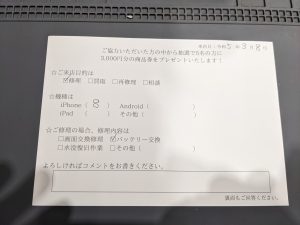 スマホスピタル 新宿 iPhone8のバッテリー交換のお客様よりコメントを頂きました。
