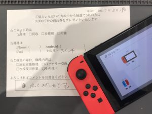 スマホスピタル 新宿 NintendoSwitchのジョイコン充電不良修理のお客様よりコメントを頂きました。