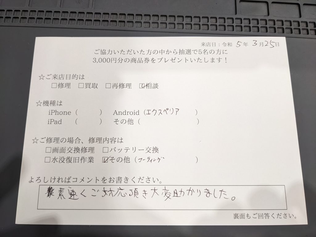 スマホスピタル 新宿 XperiaXZ3のコーティングのお客様よりコメントを頂きました