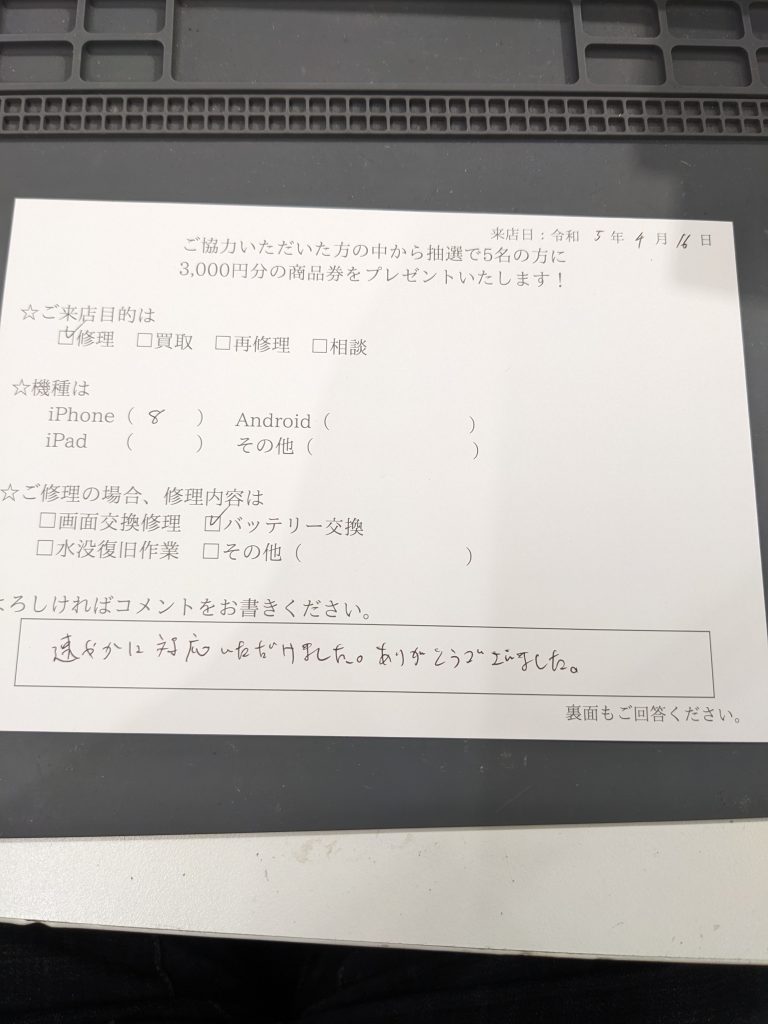 スマホスピタル 新宿 iPhone8のバッテリー交換のお客様よりコメントを頂きました。